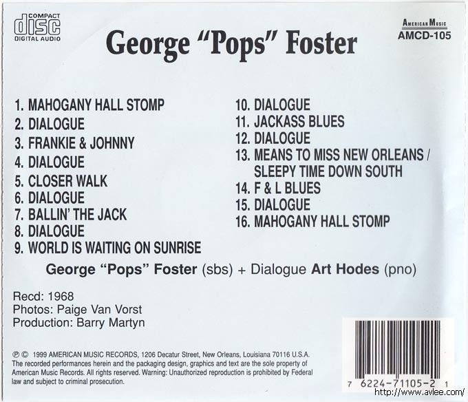 JAZZCD名称:With Art Hodes 艺术家名称:George Foster 发行公司:AMERICAN MUSIC发行编号:AMCD-105发行日期:1999年
