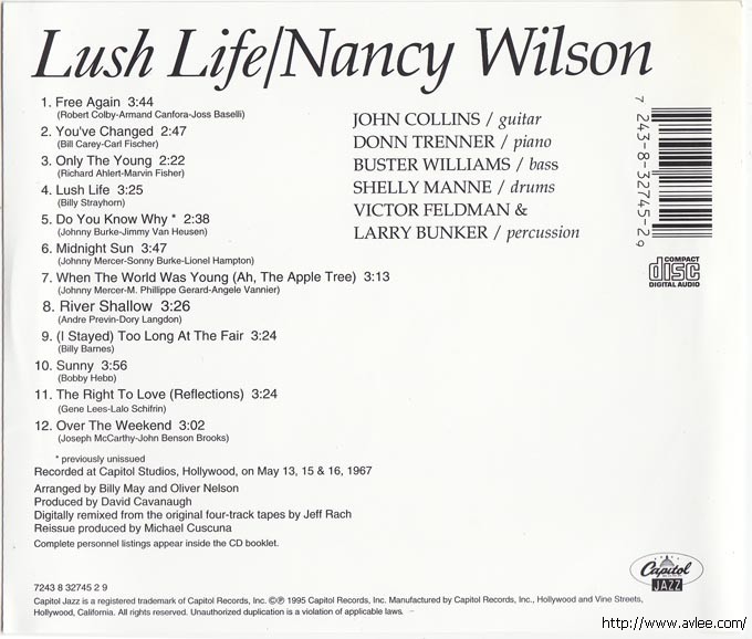 JAZZCD名称: Lush Life 艺术家名称:Nancy Wilson 发行公司:CAPITOL JAZZ发行编号:7243 8 32745 2 9发行日期:1995年