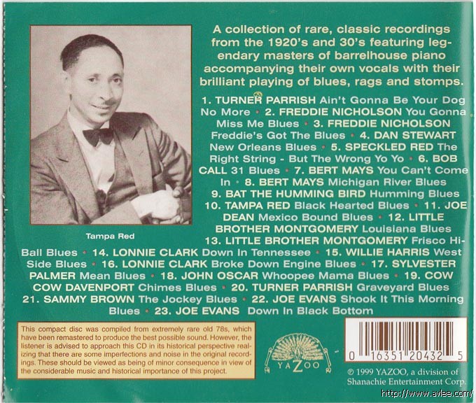 JAZZCD名称:Down in Black Bottom: Lowdown Barrelhouse Piano 艺术家名称: Various Artists发行公司:YAZOO发行编号:YAZOO 2043发行日期:1999年