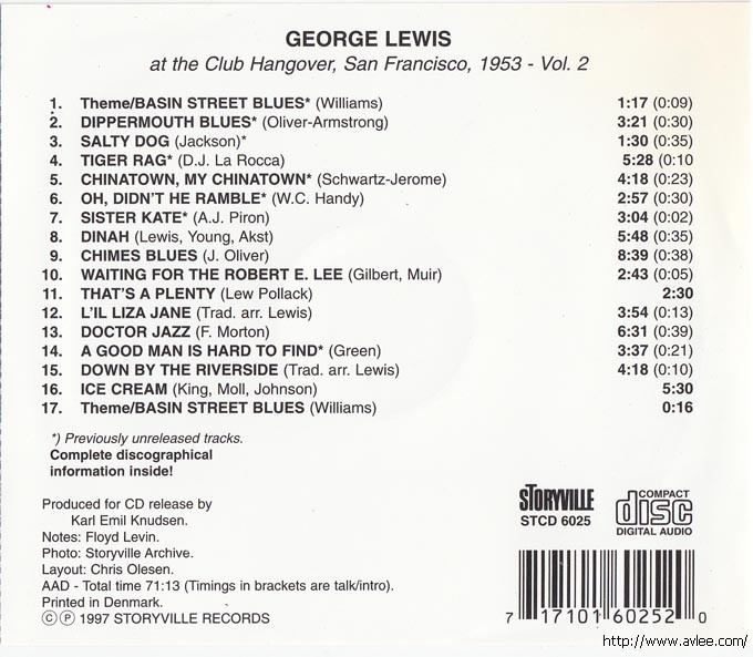 JAZZCD名称:At the Club Hangover, San Francisco, 1953 Vol. 2 艺术家名称:George Lewis 发行公司:STORYVILLE发行编号:STCD 6025发行日期:1997年