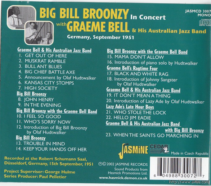 JAZZCD名称:Big Bill Broonzy in Concert 艺术家名称:Big Bill Broonzy发行公司:JASMINE RECORDS发行编号:JASMCD 3007发行日期:2002年