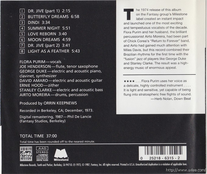 JAZZCD名称:Butterfly Dream 艺术家名称:Flora Purim发行公司:MILESTONE 发行编号:OJCCD-315-2发行日期:1987年