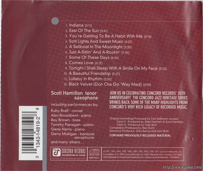 JAZZCD名称:Concord Jazz Heritage Series 艺术家名称:Scott Hamilton 发行公司:Concord Records 发行编号:CCD-4819-2发行日期:1997年