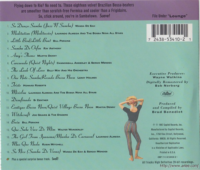 JAZZCD名称:Bossa Novaville: Ultra Lounge 14 艺术家名称:Various Artists 发行公司:Capitol 发行编号:CDP 7243 8 53410 2 1发行日期:1997年