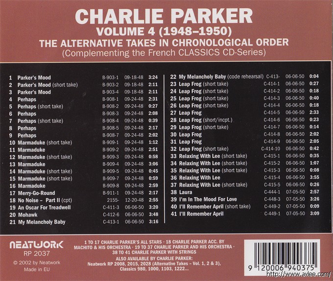 JAZZCD名称:The Alternative Takes, Vol. 4: 1948-1950 艺术家名称:Charlie Parker发行公司:NEATWORK 发行编号:PR 2037发行日期:2002年