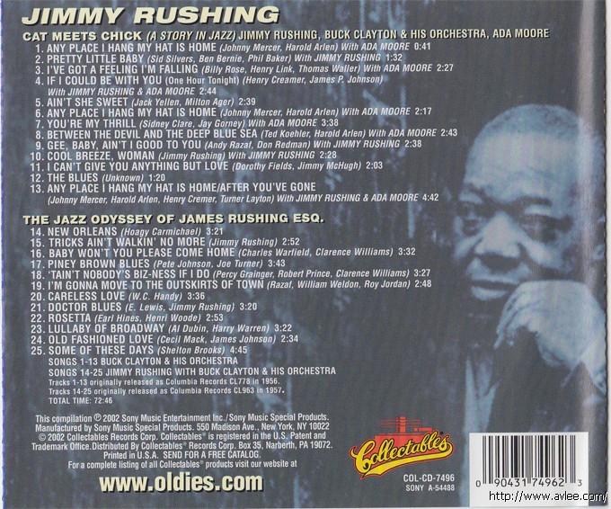 JAZZCD名称:Cat Meets Chick/Jazz Odyssey of James Rushing Esq 艺术家名称:Jimmy Rushing发行公司:Collectables发行编号:COL-CD-7495发行日期:2002年