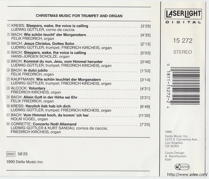 JAZZCD名称:Christmas Music for Trumpet and Organ / Ludwig 艺术家名称:Ludwig Güttler发行公司:LaserLight 发行编号:15 272发行日期:1990年