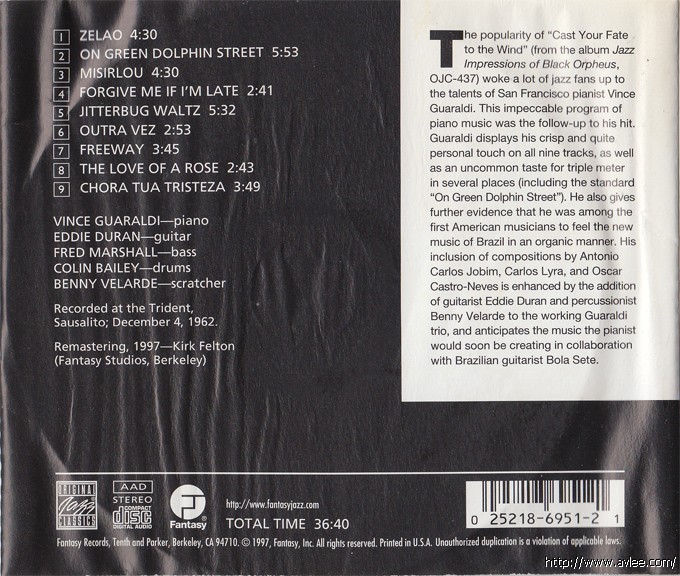 JAZZCD名称:In Person 艺术家名称:Vince Guaraldi发行公司:FANTASY 发行编号:OJCCD-951-2发行日期:1997年