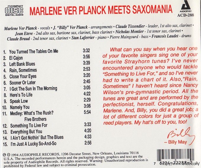 JAZZCD名称:Meets Saxomania 艺术家名称:Marlene Verplanck 发行公司:Audiophile发行编号:ACD-288发行日期:1994年