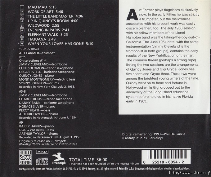 JAZZCD名称:Art Farmer Septet 艺术家名称:Art Farmer / Art Septet Farmer 发行公司:PRESTIGE发行编号:OJCCD-054-2发行日期:1993年
