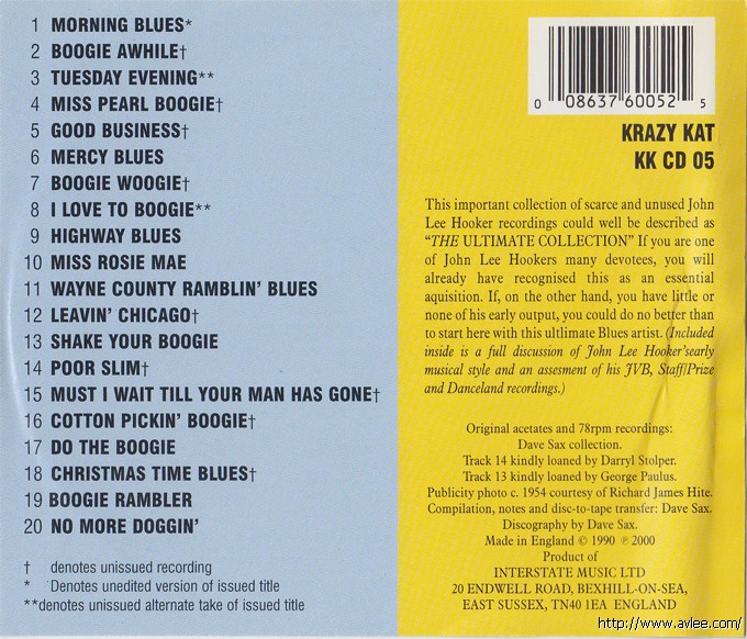 JAZZCD名称:Boogie Awhile 艺术家名称:John Lee Hooker发行公司:KRAZY KAT发行编号:KK CD 05发行日期:2000年