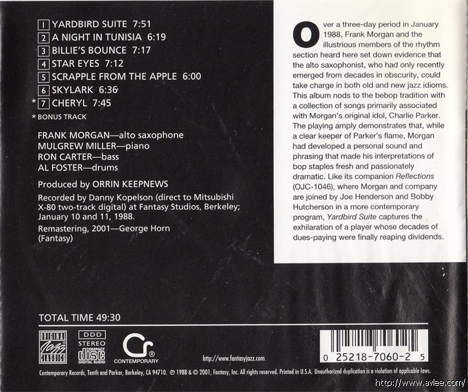 JAZZCD名称:Yardbird Suite艺术家名称:Frank Morgan / Frank Morgan Quartet发行公司:CONTEMPORARY发行编号:OJCCD-1060-2发行日期:2001年