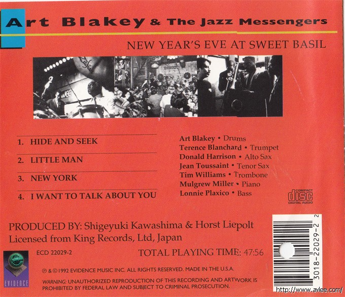 JAZZCD名称:New Year's Eve at Sweet Basil 艺术家名称:Art Blakey发行公司:Evidence 发行编号:ECD 22029-2发行日期:1992年