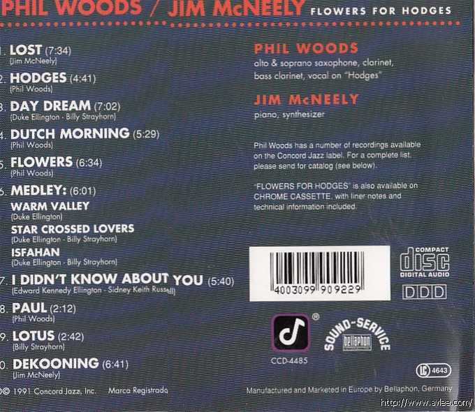 JAZZCD名称:Flowers for Hodges 艺术家名称:Phil Woods, Jim McNeely 发行公司:Concord Records 发行编号:CCD-4485发行日期:1991年