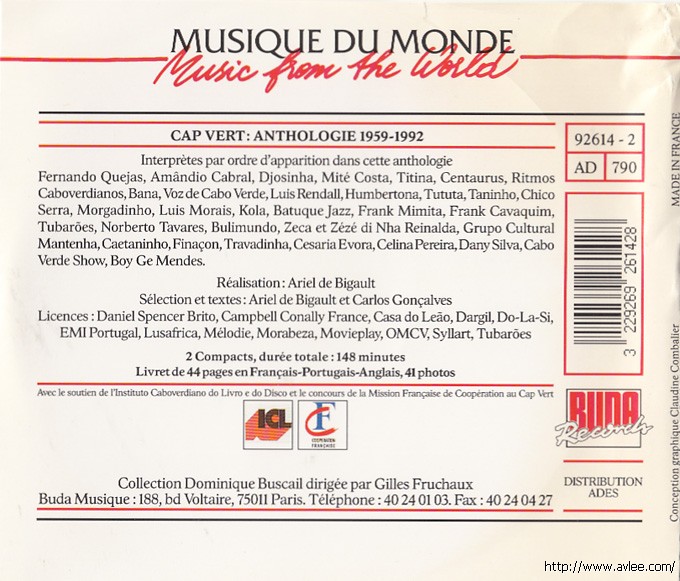 JAZZCD名称:Cap Vert : Anthologie 1959-1992 艺术家名称:Cape Verde: Anthology发行公司: buda 发行编号:92614-2发行日期:1999年