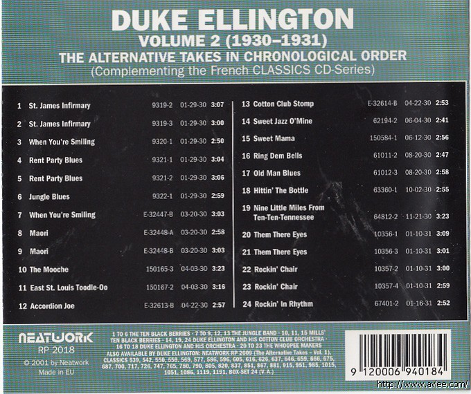 JAZZCD名称:The Alternative Takes, Vol. 2: 1930-1931 艺术家名称:Duke Ellington 发行公司: Neatwork 发行编号: Neatwork rp 2018发行日期:2001年