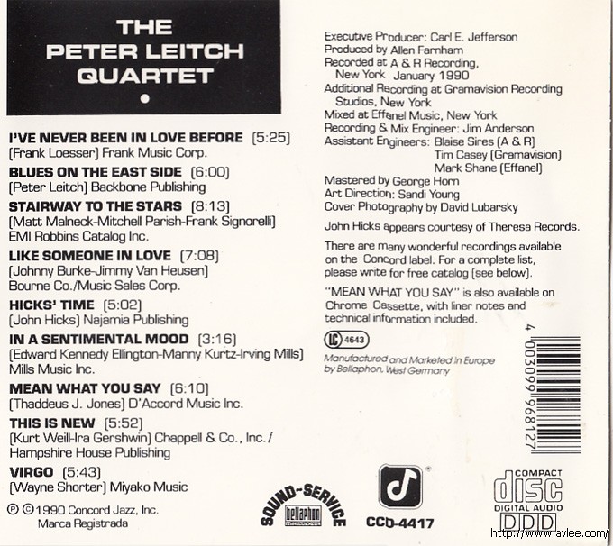 JAZZCD名称:Mean What You Say 艺术家名称:Peter Leitch 发行公司:CONCORD JAZZ 发行编号:CCD-4417 发行日期:1990年 唱片美图: