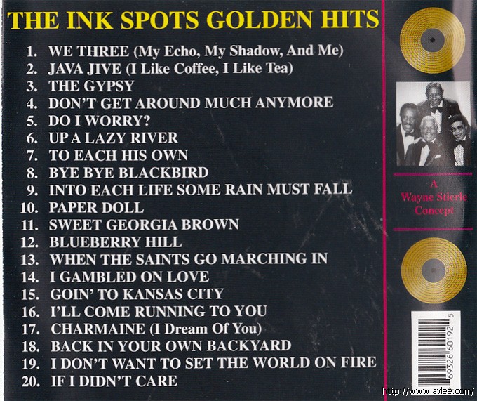 JAZZCD名称:Encore of Golden Hits 艺术家名称:Ink Spots 发行公司:Jukebox Treasures 发行编号:JBT-6019发行日期:1994年