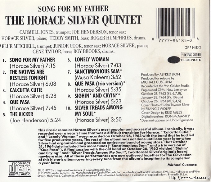 JAZZCD名称:Song For My Father 艺术家名称:The Horace Silver Quintet发行公司:Blue Note 发行编号:CDP 7841852发行日期:1989年