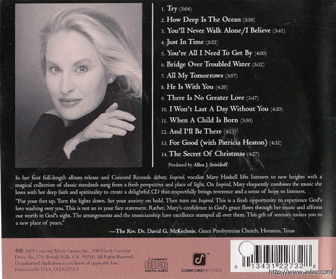 JAZZCD名称:Inspired (Standards - Good For The Soul) 艺术家名称:Mary Haskell 发行公司:CONCORD RECORDS发行编号:CCD-2273-2发行日期:2005年