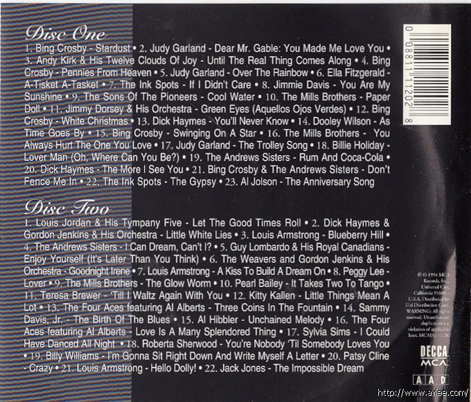 JAZZCD名称:Stardust: The Classic Decca Hits & Standards Collection 艺术家名称:Various Artists发行公司:MCA / Decca 发行编号:MCAD2-11120发行日期:1994年