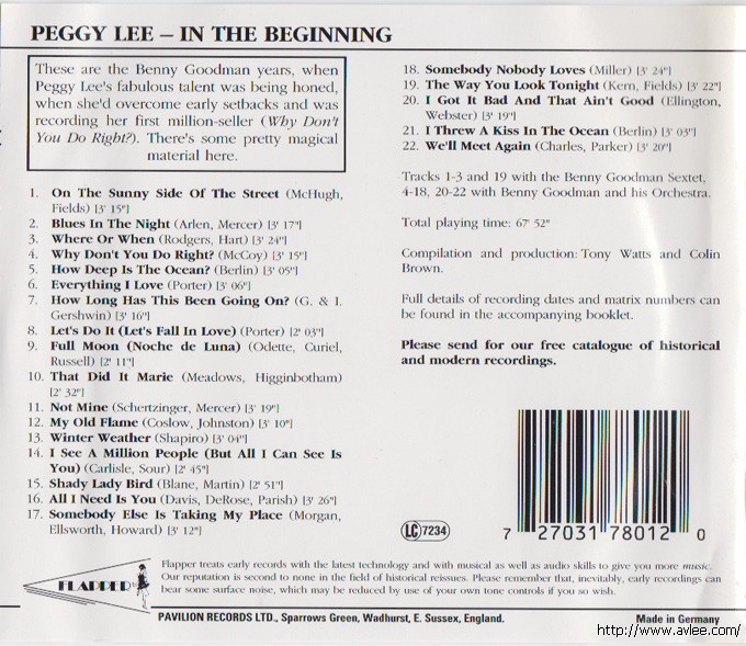 JAZZCD名称:In the Beginning: The Legend of Peggy Lee艺术家名称:Peggy Lee发行公司:Pearl Flapper发行编号:PAST CD 7801发行日期:1996年