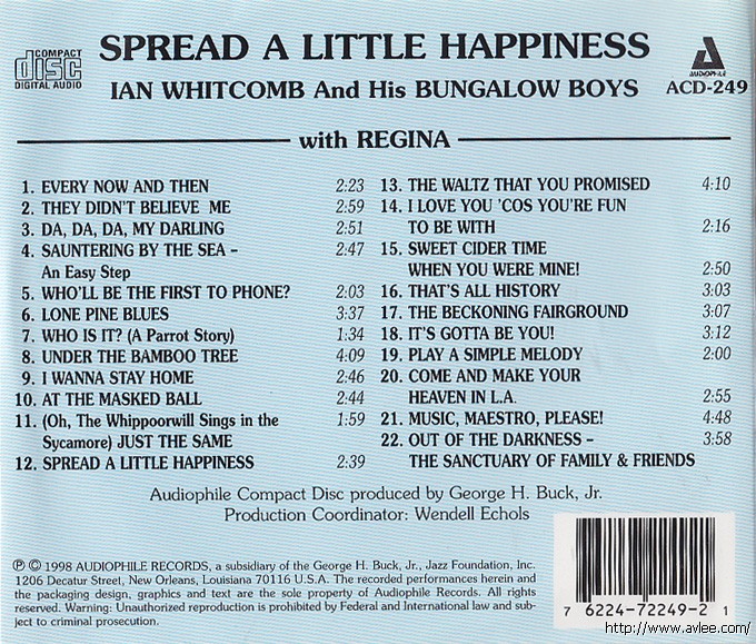 JAZZCD名称:Spread a Little Happiness 艺术家名称:Ian Whitcomb & Bungalow Boys发行公司:Audiophile发行编号:ACD-249发行日期:1998年