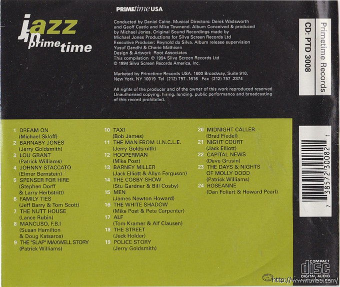 JAZZCD名称:Jazz in Primetime: Music for Television艺术家名称:Various Artists发行公司:SILVA SCREEN发行编号:PTD 3008发行日期:1994年