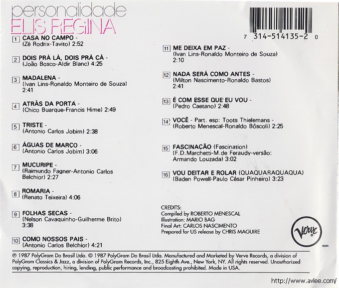 JAZZCD名称:Personalidade艺术家名称:Elis Regina |发行公司:Verve Records发行编号:314514135-2发行日期:1987年