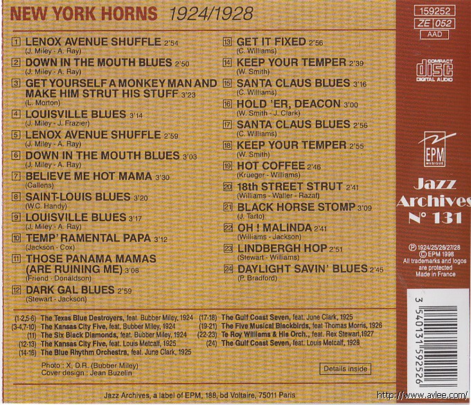 JAZZCD名称:New York Horns 1924-1928 艺术家名称:Bubber Miley发行公司:EPM发行编号:159252发行日期:1998年