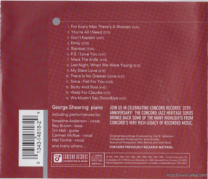 JAZZCD名称:The Concord Jazz Heritage Series艺术家名称:George Shearing发行公司:Concord Records发行编号:CCD-4818-2发行日期:1991年