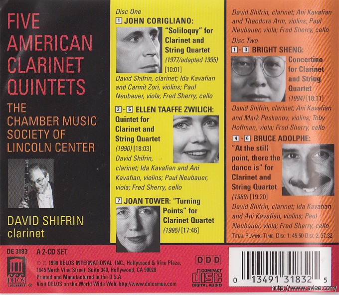 JAZZCD名称:Chamber Music Society Of Lincoln Center - Five American Clarinet Quintet艺术家名称:David Shifrin / Chamber Music Society of Lincoln发行公司:DELOS 发行编号: DE 3183发行日期:1998年