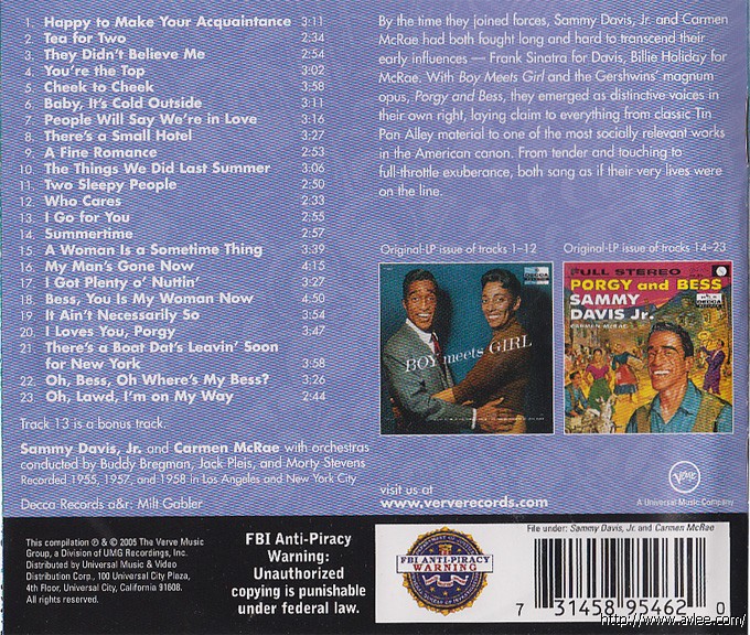 JAZZCD名称:Boy Meets Girl艺术家名称:Sammy Davis, Jr. & Carmen Mcrae On Decca发行公司:Verve发行编号:314 589 546-2发行日期:2005年