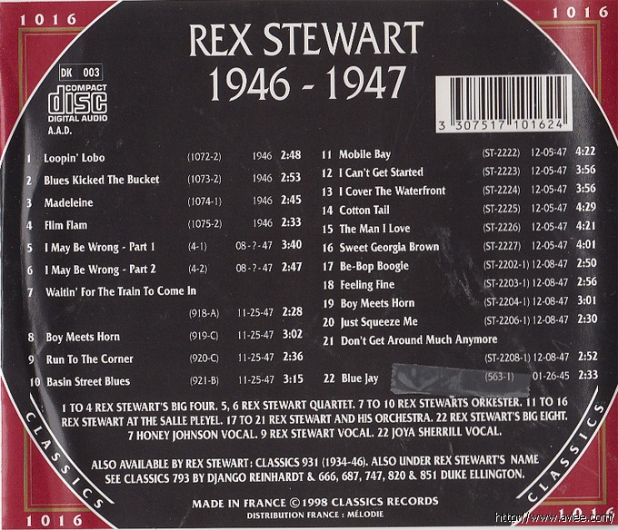 JAZZCD名称:Rex Stewart 1946-1947艺术家名称:Rex Stewart发行公司:CLASSICS发行编号:CLASSICS 1016发行日期:1998年