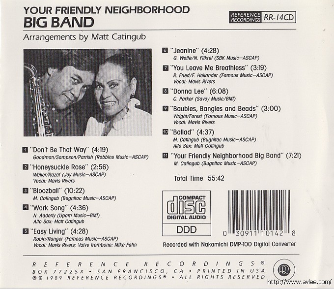 JAZZCD名称:Your Friendly Neighborhood Big Band艺术家名称:Matt Catingub发行公司:Reference Recordings发行编号:RR-14CD发行日期:1989年