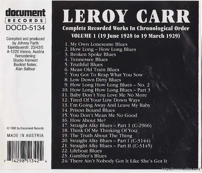 JAZZCD名称:Leroy Carr Vol. 1 (1928-1929)艺术家名称:Leroy Carr发行公司:Document Records发行编号:DOCD-5134发行日期:1992年