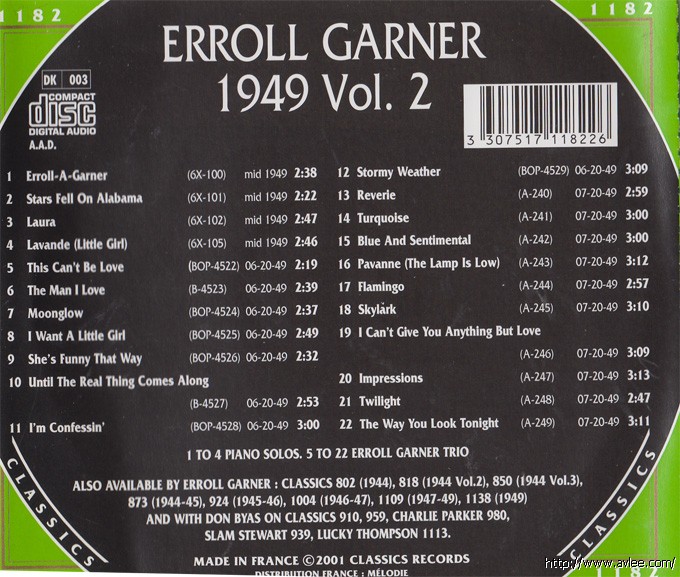 JAZZCD名称:Erroll Garner 1949 Volume 2艺术家名称:Erroll Garner 发行公司:CLASSICS发行编号:1182发行日期:2001年