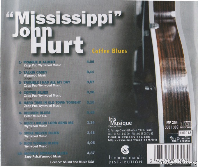 JAZZCD名称:Coffee Blues艺术家名称:Mississippi John Hurt发行公司:IMP发行编号:IMP 309-3001 309发行日期:1996年