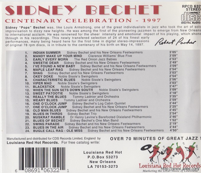 JAZZCD名称:1924-43-Great Original Perform艺术家名称:Sidney Bechet发行公司:Louisiana Red Hot Records发行编号:RPCD 632发行日期:1997年