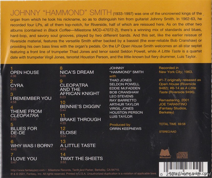 JAZZCD名称:Johnny "Hammond" Smith - Open House艺术家名称:Johnny "Hammond" Smith发行公司:Milestone发行编号:MCD 47089-2发行日期:2001年