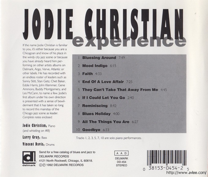 JAZZCD名称:Experience 艺术家名称:Jodie Christian 发行公司:Delmark 发行编号:DD-454 发行日期:1992年 唱片美图: