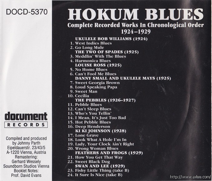 JAZZCD名称:Hokum Blues (1924-1929)艺术家名称:Hokum Blues发行公司:document records发行编号:DOCD-5370发行日期:1995年