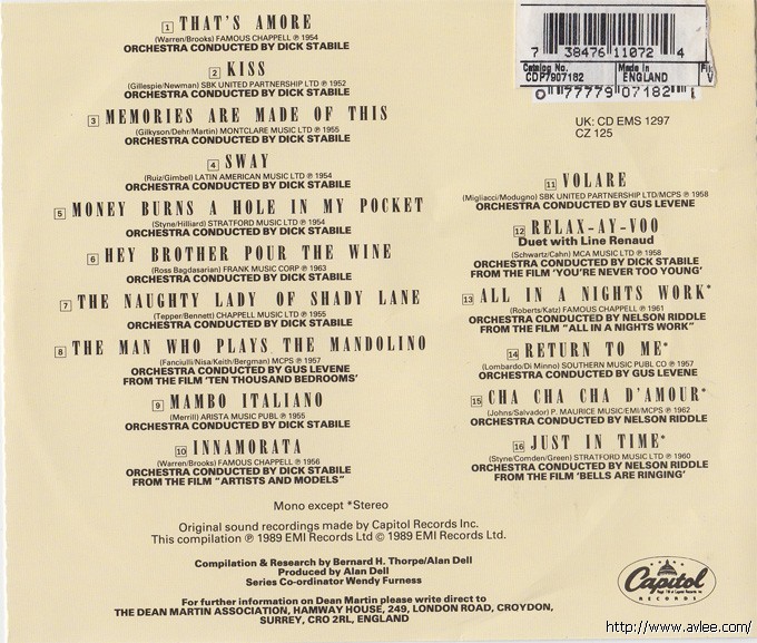 JAZZCD名称:The Best Of "The Capitol Years"艺术家名称:Dean Martin发行公司:Capitol Records 发行编号:CDP 7907182发行日期:1989年