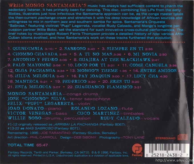 唱片曲目: 1. Quindimbia 2. Sabroso 3. Siempre En Ti 4. Chombo Chavada 5. A Ti No Mas 6. Mi Novia 7. Antonio Y Pedro 8. Guajiro At The Blackhawk 9. Palo Mayombe 10. Loco Por Ti 11. Come Candela 12. Olga Pachanga 13. Mongo's Theme 14. Entre Amigos 15. Hilda Melodia 16. Pay Joaquin 17. Lucy Cha 18. Manteca 19. Federico 20. Eres Tu 21. Esta Melodia 22. Guaguanco Flamenco