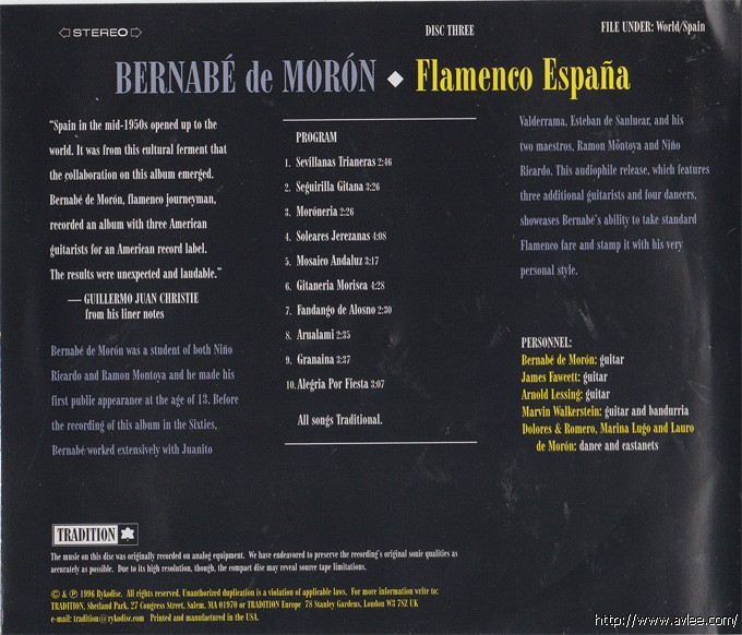 JAZZCD名称:Flamenco Espana 艺术家名称:Bernarbe de Moron发行公司:Tradition Records 发行编号:TCD 3004/3发行日期:1996年