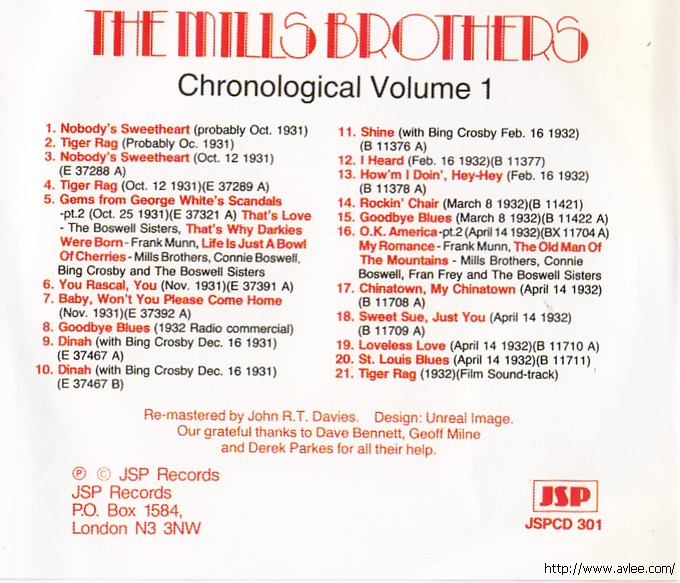 JAZZCD名称:Chronological, Vol. 1艺术家名称:Mills Brothers 发行公司:JSP RECORDS 发行编号:JSPCD 301发行日期:1999年
