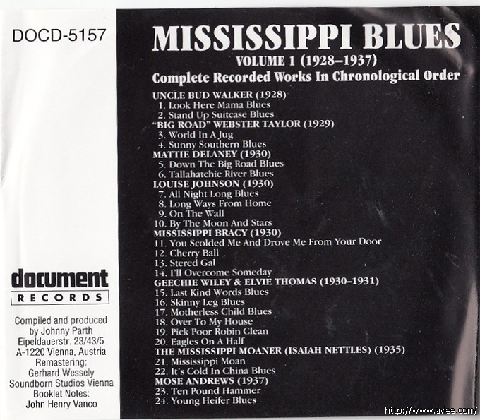 JAZZCD名称:Mississippi Blues Vol. 1 (1928-1937)艺术家名称:Various artists发行公司:DOCUMENT发行编号:DOCD-5157发行日期:1993年