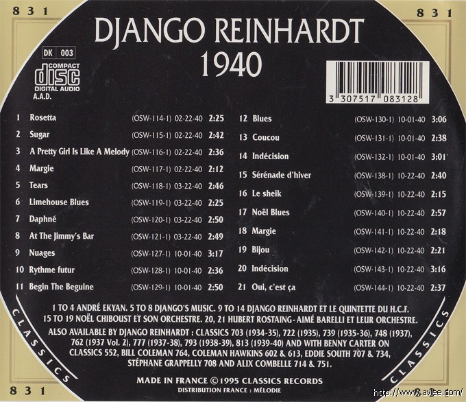 JAZZCD名称:Django Reinhardt 1940 艺术家名称:Django Reinhardt发行公司:CLASSICS发行编号:831发行日期:1995年
