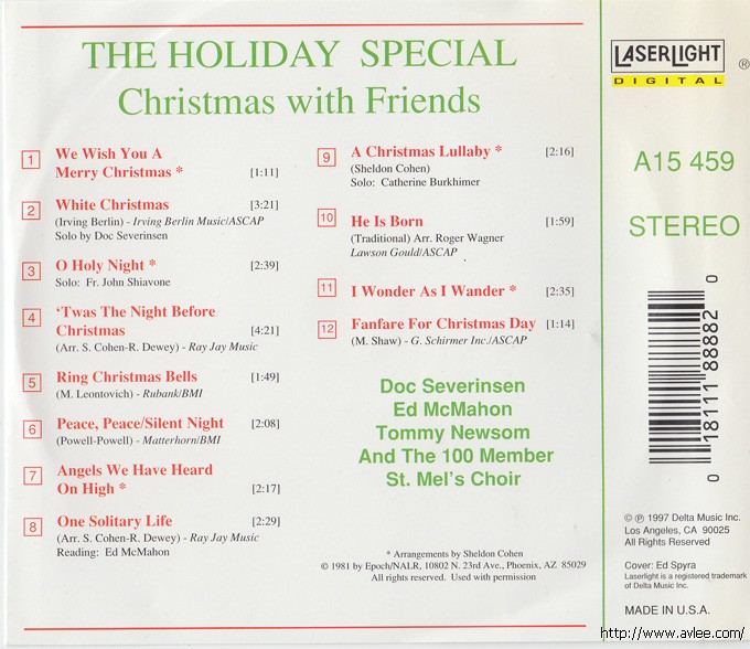 JAZZCD名称:THE HOLIDAY SPECIAL Christmas With Friends 艺术家名称:Boone/Carr/Orlando/Reynolds发行公司:Laserlight 发行编号:A15 459发行日期:1992年