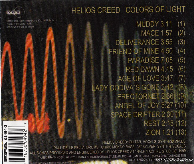JAZZCD名称:Colors of Light 艺术家名称:Helios Creed发行公司:Dossier 发行编号:DCD 9094发行日期:1999年